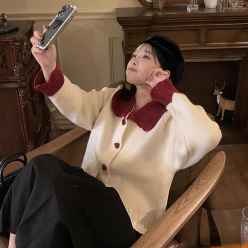 Cardigan Women Patchwork Peter Pan Collar Heart Design Lovely College Casual Young Cozy Stylish Fashion Retro Japanese Ulzzang