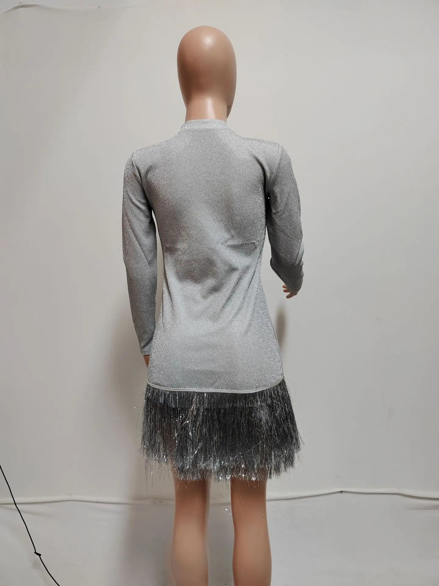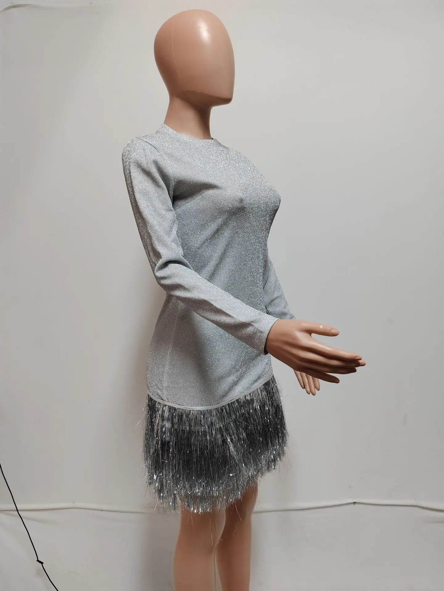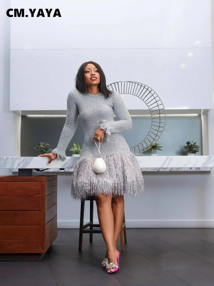 CM.YAYA Fashion Women Silver Tassel Bodycon Mini Midi Dress 2024 Autumn Winter Long Sleeve Party Club Evening Dresses Vestidos