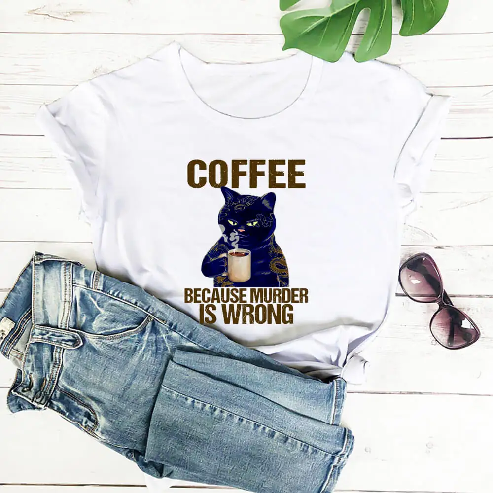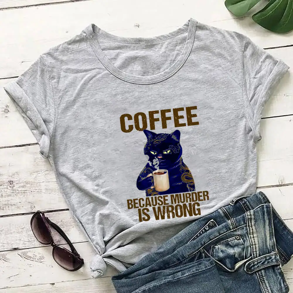 Coffee Cat Printed 100%Cotton Women's Tshirt Cat Mom Life Funny Summer Casual O-Neck Short Sleeve Tops Coffee Lover Gift