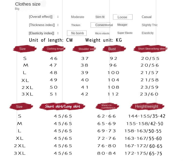 | Size | Length | Shoulder width | Bust | Short sleeve | Long sleeve | |||||